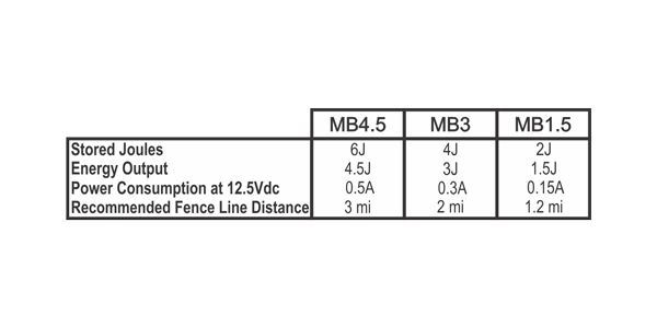 The MB1.5, MB3 and 4.5 Electric Fence Energizers have between 1.5 and 4.5 Joules output energy per pulse, to power up to 45km of fence.